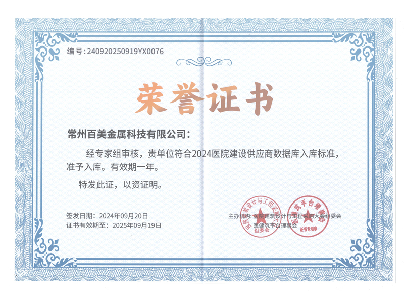 醫(yī)院建設(shè)供應(yīng)商入庫標(biāo)準(zhǔn)證書